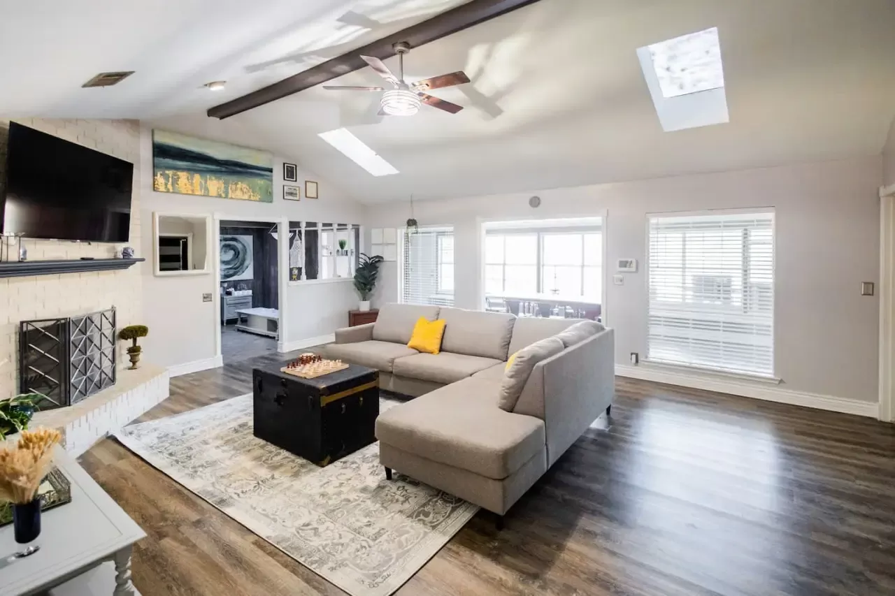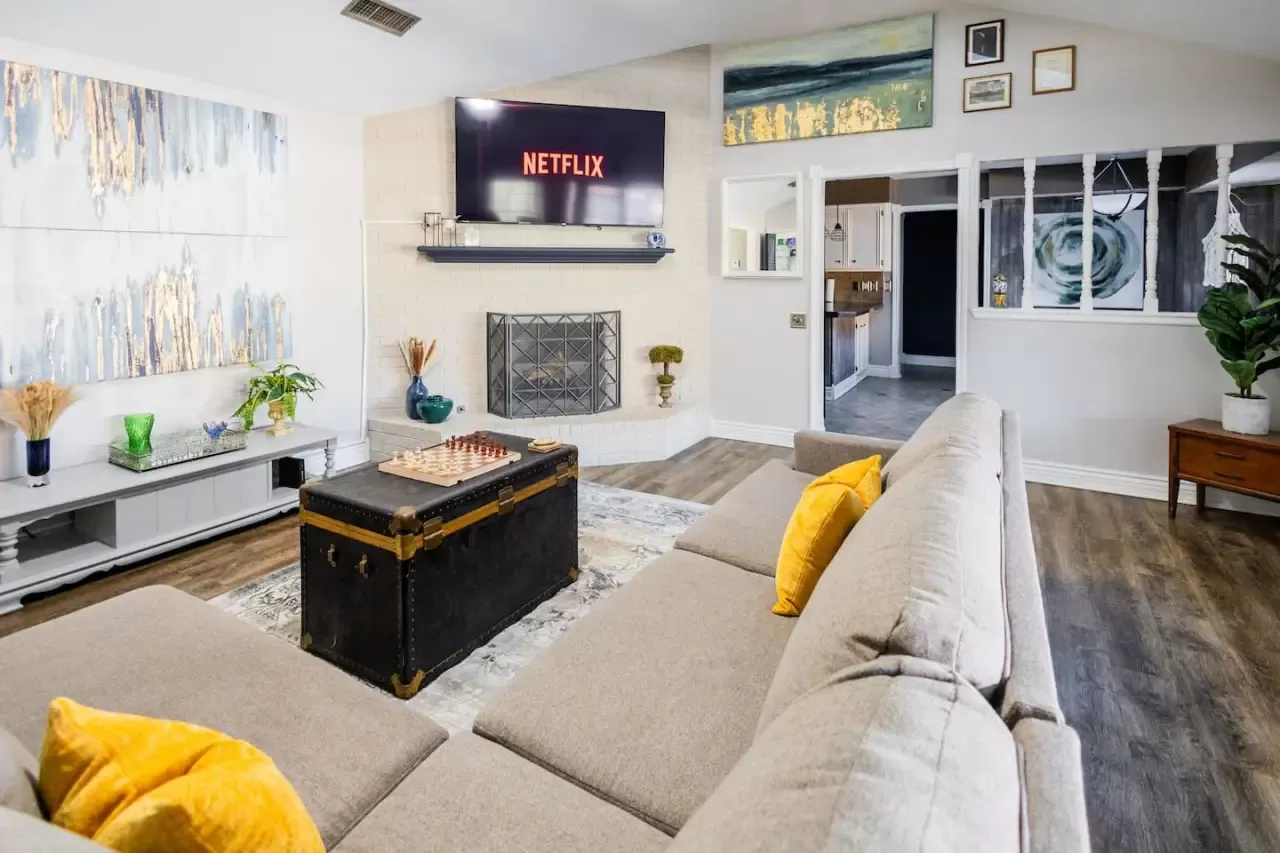 The whole group will be comfortable in this spacious and unique space. This home boast high ceilings with a still maintaining a cozy feel. This property is a newer build and flashes modern amenities throughout the space. Stunning wall art and decoration will make you feel right at home.